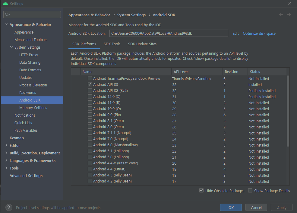 안드로이드 스튜디오 상단 탭의 Tools → SDK Manager → SDK Platforms 를 거쳐 권한에 맞는 API Level를 설치하면 된다. 이후에 gradle에서 compileSdk와 targetSdk를 설치한 API Level로 올려주고 sync를 해주면 작업을 시작할 수 있다.