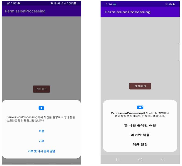 그리고 시스템 권한 대화상자도 바뀌고 있다. Android 11 버전부터 특정 권한에 대해 거부를 두 번 이상하게 될 경우 '거부 및 다시 묻지 않음' 처리를 하여 시스템 권한 대화상자가 더 이상 나오지 않는다.
