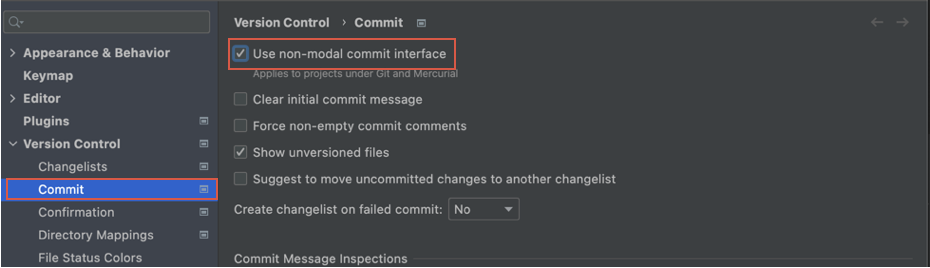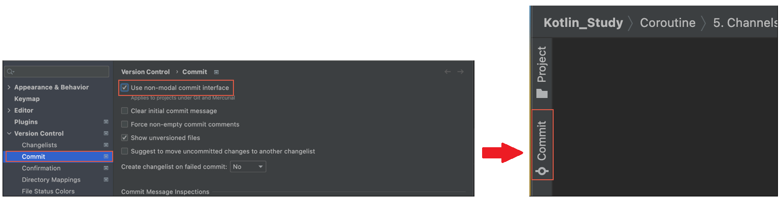 File > Settings > Version Control > Commit 에서 Use non-modal commit interface를 체크.