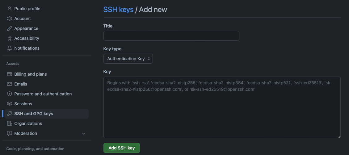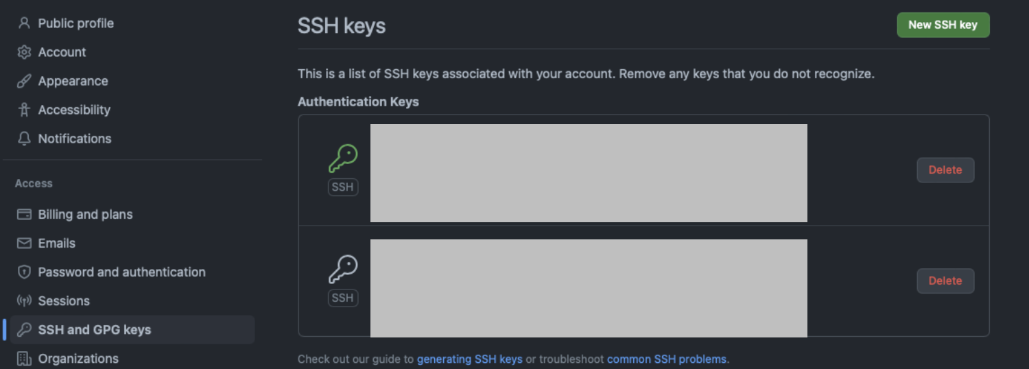 github 사이트의 Settings > Access > SSH and GPG keys 탭에 들어간다.