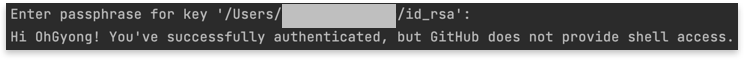 ssh -T git@github.com을 입력해서 접속 테스트를 해볼 수 있다.