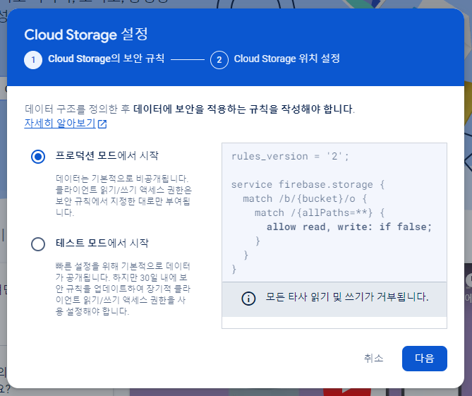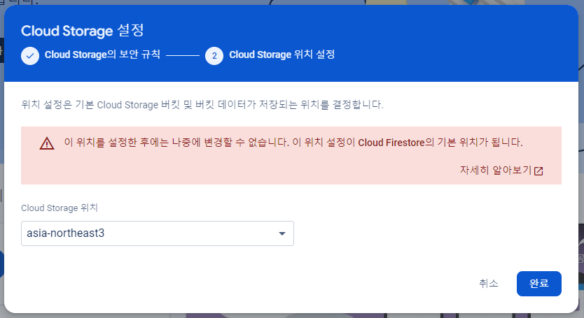 기본 버킷 생성 중 데이터를 저장하기 위해 Cloud Storage 위치를 설정하는 항목이 나온다.