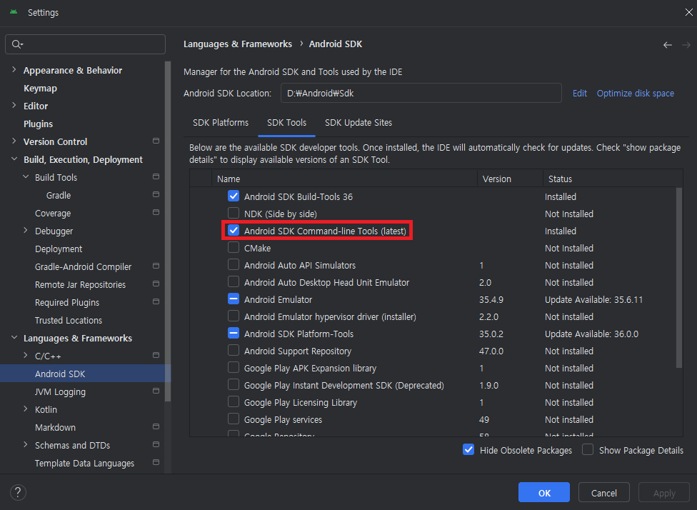 해결 방법은 'cmdline-tools'를 최신으로 업데이트 해야 한다는 것 같다. 윈도우 기준으로 File > Settings > Languages & Frameworks > Android SDK > SDK Tools 에서 'Android SDK Command-line Tools'가 있는데 해당 도구를 설치해준다. 설치 후 빌드가 성공적으로 됐다.