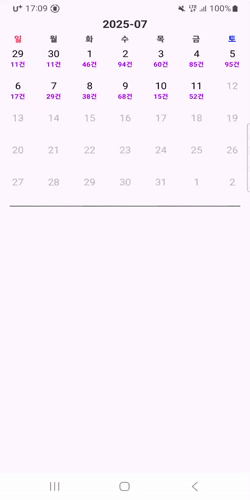MonthDayBinder에서 DayViewContainer에 선언한 countView의 텍스트를 설정해 준다. useData 블록 내에서 sampleList의 날짜와 CalendarView의 날짜와 일치하는 값을 찾아서 적용하면 된다. 추가로 클릭했을 때와 제한 범위를 고려하여 텍스트 색상 등을 적용했다.