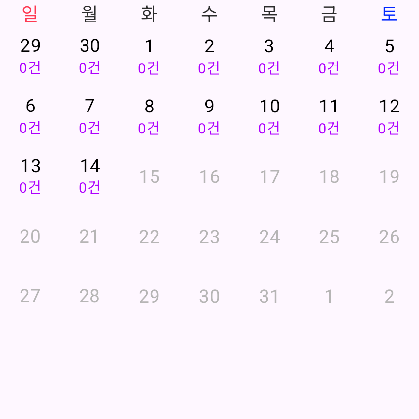 HorizontalCalendar의 monthHeader를 통해 캘린더의 머리글을 정할 수 있는데, 요일명을 넘겨줘서 요일을 표시했다. 요일을 표시할 때 일요일과 토요일은 컬러를 각각 빨간색과 파란색으로 했다.
