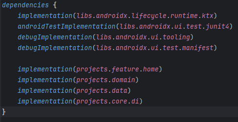 enableFeaturePreview("TYPESAFE_PROJECT_ACCESSORS")는 문자열 기반의 모듈 종속성을 코틀린 객체로 자동 변환을 시켜주고, gradle에 projects 접근 권한을 부여한다.(settings.gradle:build-logic에 선언해도 괜찮음) 이 명령어를 통해 아래와 같이 쓸 수 있다.